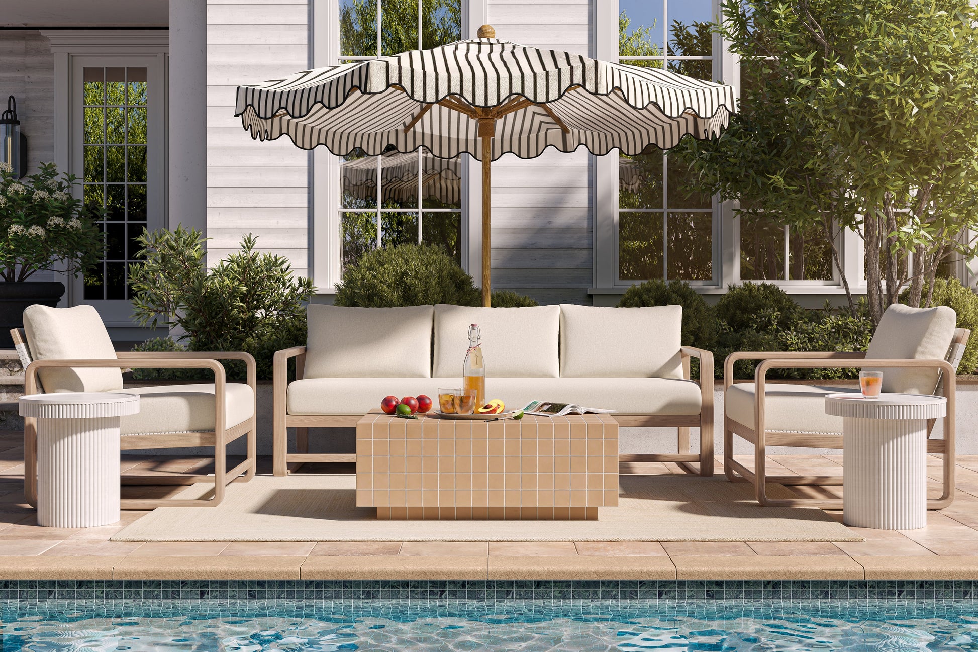 Relax in style with the Palata Outdoor Sofa, featuring a sturdy eucalyptus wood frame in a light teak finish and a distinctive woven backrest. Generously sized for lounging, its plush cream performance cushions provide lasting comfort while resisting stains and moisture. Whether entertaining guests or unwinding in the sun, this sofa brings refined elegance to any outdoor space.